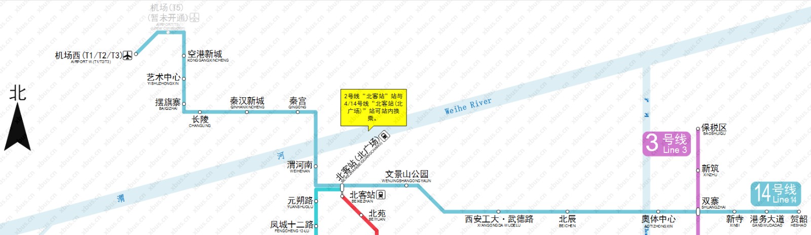 西安地铁14号线一期工程东起贺韶站,西至北客站(北广场)站;机场城际段东起北客站(北广场)站,西至机场西(T1、T2、T3)站;连接了西安咸阳国际机场、铁路西安北站等地。
